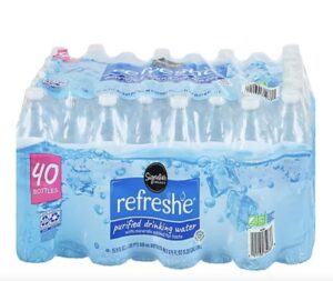 Hubby insists on bottled water, which I never understood. Why not fill your Tommy Tippy cup from the tap? The water is filtered after all. He says it’s for convenience. A case of forty bottles of water is the best value. The problem is the weight of forty bottles of water! I hail a store employee and ask him to load the heavy case of water into my cart. He does, but he struggles. I hadn’t thought about how I was going to get it into the car or the house.